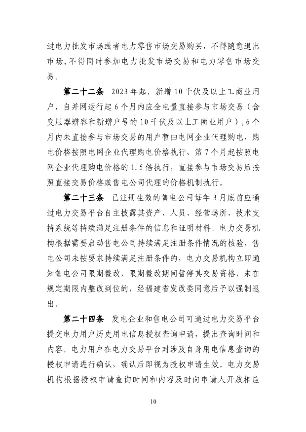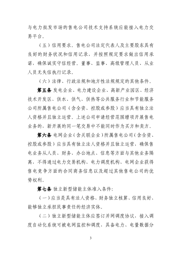 (三)獨(dú)立新型儲(chǔ)能主體參與電能量市場應(yīng)滿足最大充 放電功率、最大調(diào)節(jié)容量及持續(xù)充放電時(shí)間的準(zhǔn)入條件,充 電/放電功率不小于 1 萬千瓦,且持續(xù)時(shí)間不小于 1 個(gè)小時(shí)。 第八條 直接參與市場交易用戶(除居民、農(nóng)業(yè)用電電量 外)原則上應(yīng)全電量入市。已直接參與市場交易的高耗能用 戶,不得退出市場交易。