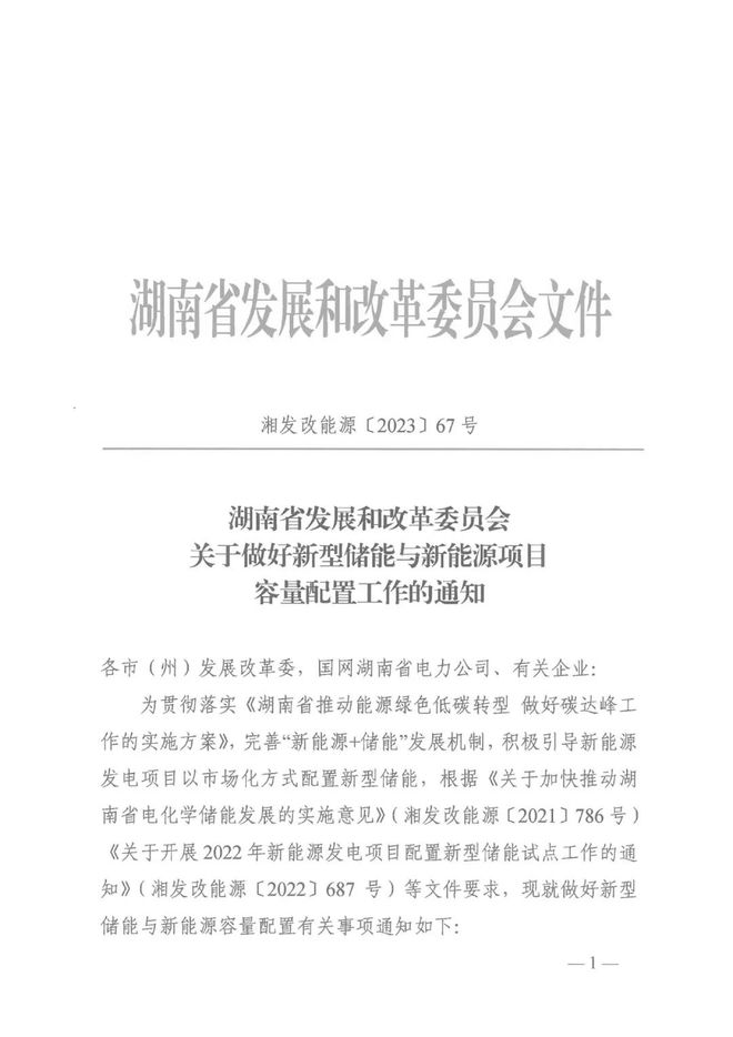 按照湖南發(fā)改委相關(guān)文件,新能源項(xiàng)目應(yīng)配置一定容量的新型儲(chǔ)能,于2022年12月底前,2023年6月底前全容量并網(wǎng)運(yùn)行的新型儲(chǔ)能試點(diǎn)項(xiàng)目分別按其裝機(jī)容量的1.5倍、1.3倍計(jì)算所配新能源容量。