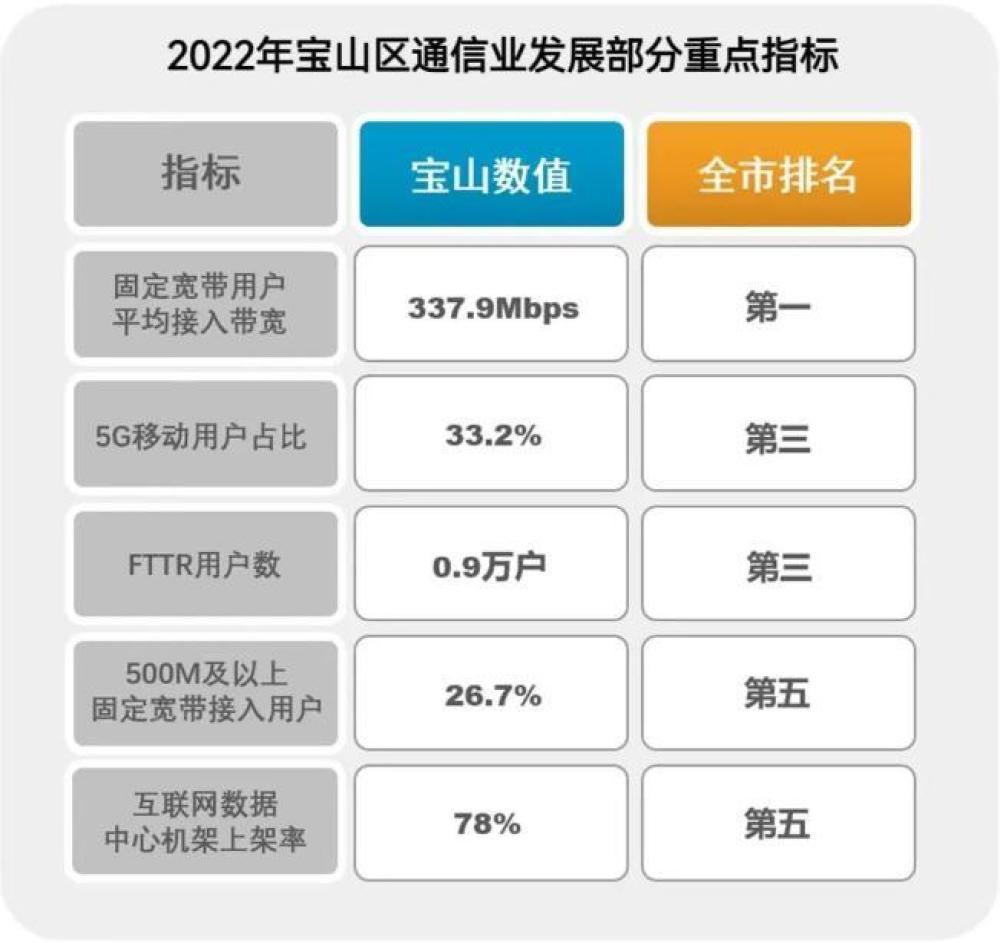 近日,市通信管理局發(fā)布《2022年上海市各行政區(qū)通信業(yè)發(fā)展重點(diǎn)指標(biāo)》,該指標(biāo)共計(jì)8項(xiàng),寶山5項(xiàng)指標(biāo)進(jìn)入全市前五,其中,寶山固定寬帶用戶(hù)平均接入帶寬位列全市第一,5G移動(dòng)用戶(hù)、FTTR用戶(hù)數(shù)占比排名全市第三。