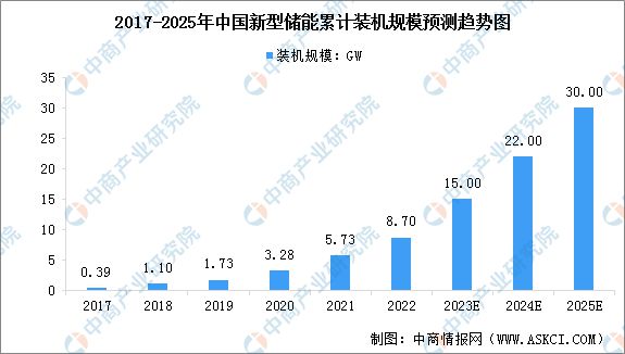 截至2021年底,我國已投運的新型儲能裝機規(guī)模達5.73GW,同比增長74.70%。根據(jù)國家能源局發(fā)布的相關(guān)數(shù)據(jù),截至2022年底,全國已投運新型儲能項目裝機規(guī)模達8.7GW,平均儲能時長約2.1小時。根據(jù)《關(guān)于加快推動新型儲能發(fā)展的指導(dǎo)意見》,預(yù)計到2025年國內(nèi)新型儲能裝機規(guī)模將增至30GW。