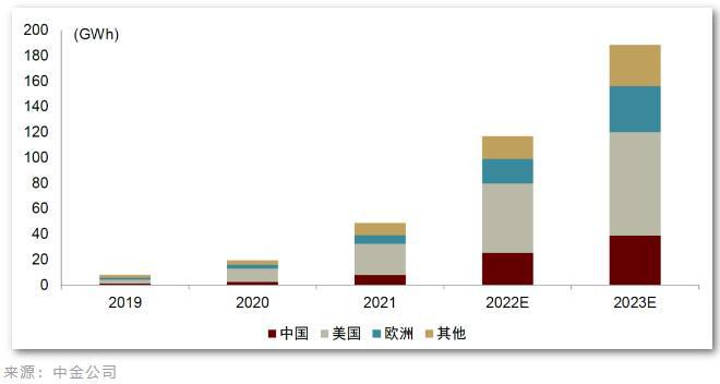 據中金公司預測,今年全球儲能需求有望達189GWh,同比增長超60%。美國、中國、歐盟成為全球三大儲能市場。