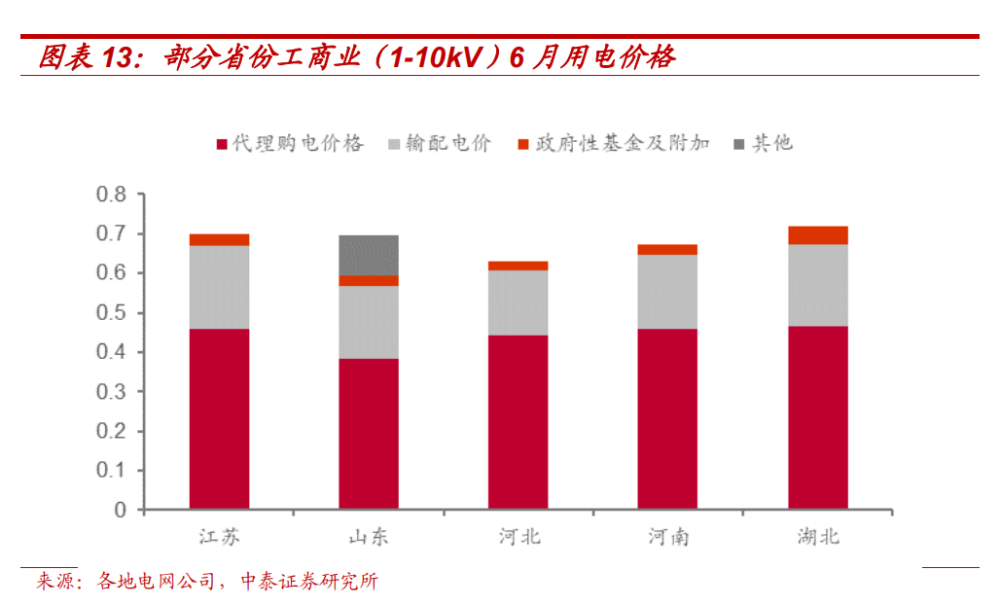 此前,關(guān)于儲能充電是否需承擔輸配電價等費用,各地沒有明確統(tǒng)一的標準?!锻ㄖ诽貏e指出,獨立儲能電站向電網(wǎng)送電的,其相應(yīng)充電電量不承擔輸配電價和政府性基金及附加,這一規(guī)定將大幅降低儲能充電成本。我們統(tǒng)計了部分省份2022年6月代理購電的用電價格,輸配電價和政府性基金及附加合計占用電價格的比例超過30%,以江蘇省為例,代理購電價格、輸配電價、政府性基金及附加分別為0.4594、0.2110、0.0294 元/kWh,輸配電價及政府性基金占用電價格比例為 34.35%。若儲能充電需支付這兩部分費用,將大幅提高充電成本,因此這一規(guī)定將明確儲能項目邊界條件,保障儲能合理收益,提高儲能投資意愿。