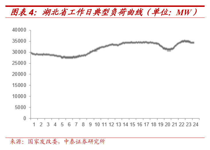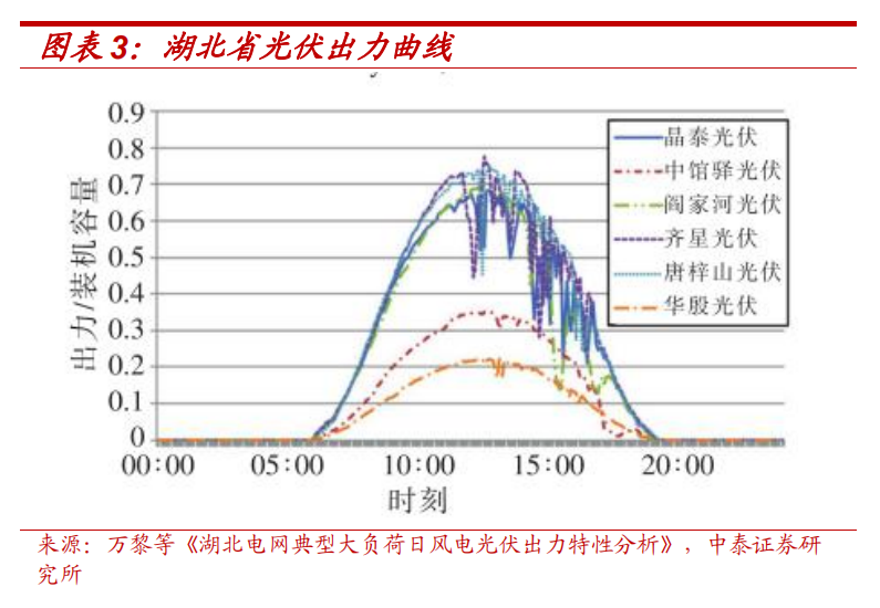 是一天中的最低位。光伏出力曲線和負荷曲線相對更適配,白天為曲線高位,但以湖北省為例,20時至23時負荷仍處于相對高位,而此時光伏出力為0。因此當新能源發(fā)電量占比達到一定程度,電源和負荷的曲線差異將對電網(wǎng)的運行效率和安全造成沖擊,或?qū)е麓罅織夛L棄光現(xiàn)象。