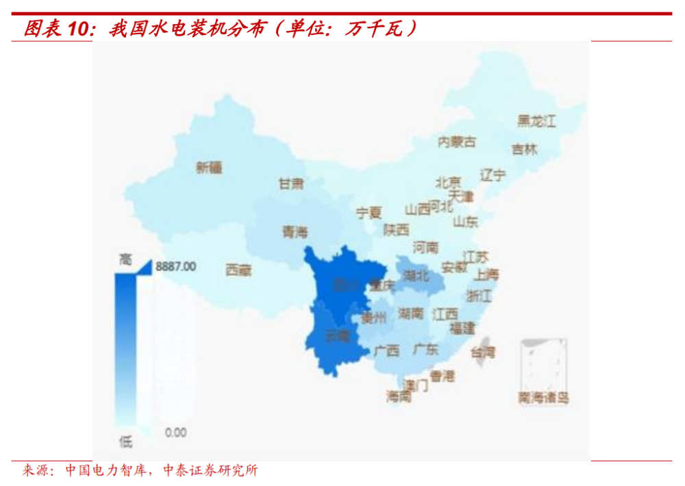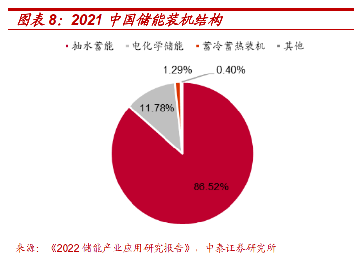 2021年中國抽水蓄能裝機功率38GW,占比全部儲能的86.52%,電化學儲能裝機功率5GW,占比11.78%,抽水蓄能是我國存量儲能的主要形式。2021年中國新增抽水蓄能裝機5GW,占比71.14%,電化學儲能新增2GW,占比24.94%,電化學儲能裝機增速超過抽水蓄能。抽水蓄能需要尋找合適地形及水域,同時可能涉及搬遷移民問題,外部限制因素較多,建設(shè)期通常長達數(shù)年。我國水電資源主要集中在南方地區(qū)尤其是西南地區(qū),西北等地區(qū)缺發(fā)建設(shè)大型抽蓄配套新能源的條件。而電化學儲能則對外界條件要求不高,建設(shè)期較短,單體投資小,因而成為新能源配儲的普遍選擇。