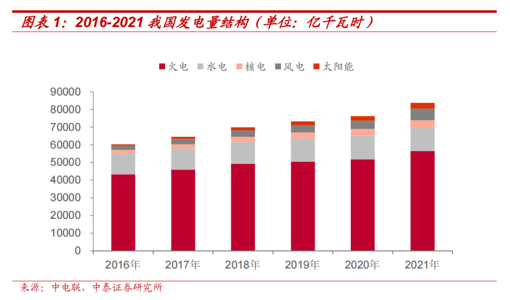 截至2021年,我國風電裝機規(guī)模328.48GW,光伏裝機規(guī)模 306.56GW。2021年風電發(fā)電量為6556億千瓦時,占比7.83%,太陽能發(fā)電量3270億千瓦時,占比3.91%,發(fā)電量合計占比 11.74%,較2016年的5.10%提升6.64pct。