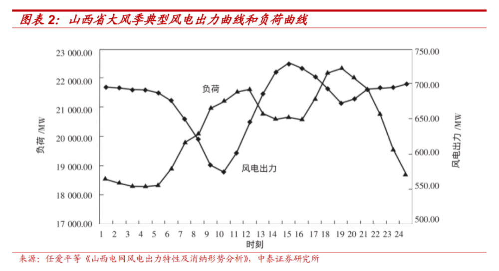 根據(jù)山西省大風季典型風電出力曲線和負荷曲線可見,風電出力和負荷二者具有較大差異,風電在21時至次日5時出力處于相對高位,而此時用電負荷卻