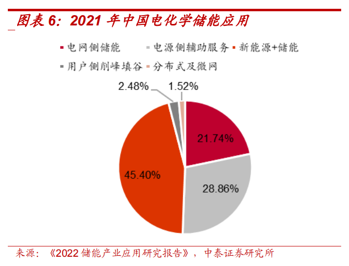 2021年起,各省密集發(fā)布新能源項目配套儲能政策,配臵比例主要在 10%-20%區(qū)間,配臵時長1-2小時,推動我國電化學儲能高速增長。根據(jù)《2022儲能產(chǎn)業(yè)研究報告》,2021年我國新能源配儲占電化學儲能應(yīng)用的45.40%,我國電化學儲能主要應(yīng)用在電源側(cè)和電網(wǎng)側(cè)來支持風光新能源消納和新型電力系統(tǒng)建設(shè)。