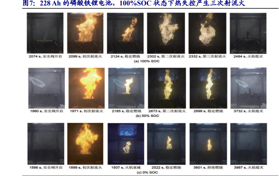 在模擬燃燒實(shí)驗(yàn)中,鋰電池的燃燒過程包括受熱鼓脹、初次射流火、穩(wěn)定燃燒、 多次射流火、火焰熄滅等過程。不同 SOC(電池中剩余的電荷余量,100%為滿電)狀態(tài)下,鋰電池會(huì)產(chǎn)生 2-3 次射流火,100%狀態(tài)下熱失控溫度僅為 167℃,而燃燒 峰值溫度將達(dá)到 573℃。