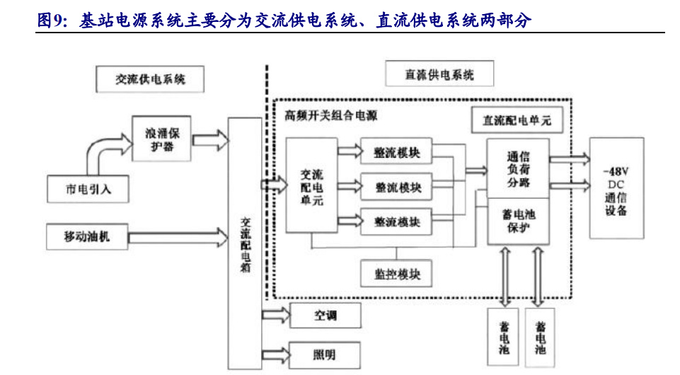 通信儲(chǔ)能作為通信基站的配套基礎(chǔ)設(shè)施,是保障通信系統(tǒng)實(shí)現(xiàn)可靠運(yùn)行的關(guān)鍵。 開年以來,北京、上海、深圳、寧夏、大連、吉林等省市宣布 5G 基站建設(shè)目標(biāo),1 月 31 日,北京宣布將在 2023 年新建 1 萬個(gè)以上 5G 基站;2 月 8 日,寧夏宣布將在 2023 年新建 5G 基站 2000 個(gè),累計(jì)達(dá)到 13000 個(gè);2 月 11 日,上海計(jì)劃 2023 年新 建 1 萬個(gè) 5G 基站;2 月 10 日,深圳市工信局發(fā)布《深圳市極速先鋒城市建設(shè)行動(dòng) 計(jì)劃》,計(jì)劃指出要全面提升 5G 網(wǎng)絡(luò)能效,全年新增 5G 基站 10000 個(gè)。2 月 13 日, 吉林省通信管理局公布 5G 基站相關(guān)數(shù)據(jù):2022 年建成 5G 基站 13042 個(gè),累計(jì)建成 5G 基站 34092 個(gè),并宣布了 2023 年目標(biāo):力爭新建 5G 基站 8000 個(gè)。2 月 14 日, 大連市通信管理局宣布全年全域?qū)⑿陆?5G 基站 4000 個(gè)以上,力爭年底建成 19000 個(gè) 5G 基站,重點(diǎn)場(chǎng)所網(wǎng)絡(luò)通達(dá)率提升至 99%。 我國 5G 基站的建設(shè)運(yùn)營模式主要采用中國鐵塔建塔、引電建設(shè)基礎(chǔ)配套設(shè)施, 移動(dòng)、聯(lián)通、電信三大主運(yùn)營商租塔、安裝設(shè)備并進(jìn)行網(wǎng)絡(luò)運(yùn)營的模式,運(yùn)營電費(fèi) 由鐵塔代運(yùn)營商統(tǒng)一向電力部門繳納。5G 基站開通后電費(fèi)成本開支已高于鐵塔租費(fèi), 較大的 5G 基站耗電量已經(jīng)成為阻礙 5G 和制約行業(yè)發(fā)展的一個(gè)重要因素。利用儲(chǔ)能 裝置在負(fù)荷高峰時(shí)期放電,負(fù)荷低谷時(shí)期從電網(wǎng)充電,減少高峰負(fù)荷需求,節(jié)省用電費(fèi)用,從而達(dá)到改善負(fù)荷特性、參與系統(tǒng)調(diào)峰的目的,同時(shí)節(jié)省電費(fèi)、最大限度 套利。 基站電源系統(tǒng)主要分為交流供電系統(tǒng)、直流供電系統(tǒng)兩部分。交流供電系統(tǒng)包 含市電引入、移動(dòng)油機(jī)、浪涌保護(hù)器、交流配電箱等。直流供電系統(tǒng)包含高頻開關(guān) 組合電源,蓄電池等。