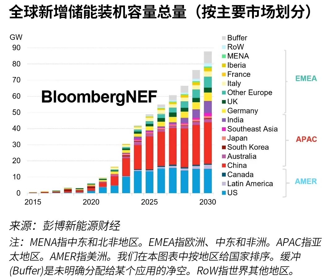按GW計,到2030年美洲地區(qū)將占到年度儲能裝機容量的21%。受加州、西南部和德克薩斯州的一系列大型項目帶動,美國是迄今為止最大的市場。由于電池成本上升,美國出現了一波項目延遲。盡管如此,美國公用事業(yè)公司繼續(xù)采購與光伏配套的儲能,以提高系統(tǒng)可靠性。與此同時,一些長時儲能項目獲得發(fā)展動力。智利市場改革可能為拉丁美洲新興儲能市場新增裝機容量加速鋪平道路。智利和巴西各地光伏和風電裝機容量迅速增長,墨西哥電網投資不足,這可能為儲能提供機會。