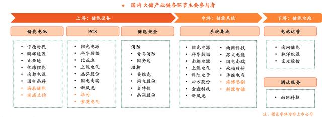 大儲(chǔ)產(chǎn)業(yè)鏈主要包括上游儲(chǔ)能設(shè)備、中游系統(tǒng)集成、下游電站等環(huán)節(jié)。儲(chǔ)能電池和PCS是大儲(chǔ)產(chǎn)業(yè)鏈價(jià)值量最大的兩個(gè)環(huán)節(jié),陳驍?shù)热苏J(rèn)為,儲(chǔ)能電池絕對(duì)龍頭寧德時(shí)代,第二梯隊(duì)比亞迪、鵬輝能源、億緯鋰能、國軒高科、南都電源、海辰儲(chǔ)能等有望借國內(nèi)大儲(chǔ)市場加速贏得動(dòng)力電池之外的第二成長曲線。國內(nèi)大儲(chǔ)PCS頭部企業(yè)陽光電源、科華數(shù)據(jù)、上能電氣、盛弘股份、國電南瑞、新風(fēng)光等在裝機(jī)提速+毛利改善下業(yè)績有望受益。