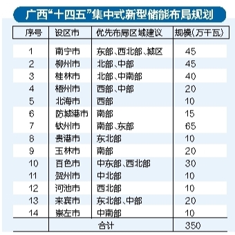 近日,自治區(qū)發(fā)展改革委印發(fā)《廣西新型儲(chǔ)能發(fā)展規(guī)劃(2023—2030年)》(以下簡(jiǎn)稱《規(guī)劃》)。從廣西“十四五”集中式新型儲(chǔ)能布局規(guī)劃(見下表)來看,欽州市將建設(shè)65萬千瓦新型儲(chǔ)能,居全區(qū)第一;南寧優(yōu)先在東部、西北部、城區(qū)布局,建設(shè)45萬千瓦新型儲(chǔ)能,建設(shè)規(guī)模和柳州持平,均居全區(qū)第二。