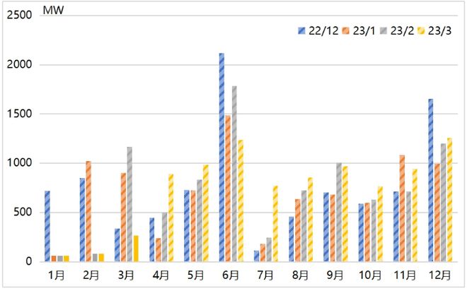 對比前期(22/12、23/1、23/2)數(shù)據(jù),發(fā)現(xiàn)2023年Q1各月儲能投運延期較為顯著,推測延期原因主要系供應(yīng)鏈問題和并網(wǎng)排隊等。根據(jù)各期數(shù)據(jù),上半年仍有投運小高峰,我們分析認為這是因為每年7-8月是美國夏季負荷高峰,是儲能獲取收益的重要月份,因此6月底前是儲能項目投運的重要時間節(jié)點。