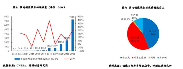 國(guó)內(nèi)儲(chǔ)能裝機(jī)有望持續(xù)增長(zhǎng),表前儲(chǔ)能為裝機(jī)主力。根據(jù)CNESA數(shù)據(jù)統(tǒng)計(jì),2012-2022年間國(guó)內(nèi)新型儲(chǔ)能新增裝機(jī)復(fù)合增 速高達(dá)95%。2022年國(guó)內(nèi)新型儲(chǔ)能新增裝機(jī)高達(dá)7.3GW,同比增長(zhǎng)近200%。就國(guó)內(nèi)儲(chǔ)能裝機(jī)類(lèi)型分布而言,根據(jù)儲(chǔ)能與 電力市場(chǎng)公眾號(hào)統(tǒng)計(jì),可再生能源配儲(chǔ)與獨(dú)立儲(chǔ)能裝機(jī)占比分別為45%與44%,用于調(diào)頻的裝機(jī)占比僅為1%,工商業(yè)用 戶(hù)側(cè)儲(chǔ)能裝機(jī)占比10%。我國(guó)當(dāng)前的儲(chǔ)能類(lèi)型主要還是以用于配套新能源裝機(jī)的表前儲(chǔ)能裝機(jī)為主。