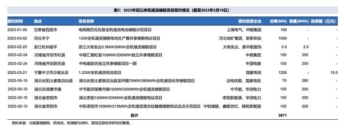 聯(lián)儲證券統(tǒng)計顯示,2022年國內(nèi)已投運的釩電池新型儲能項目裝機規(guī)模為0.2GW。截至2023年5月第三周,國內(nèi)已招標釩液流電池系統(tǒng)項目6個,合計招標功率超過44MW,參與投資的企業(yè)多為上海電氣(601727.SH)、華潤電力(00836.HK)、國家電投等國企。