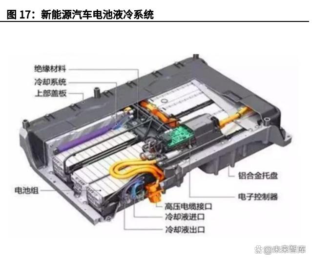 液冷系統(tǒng)的核心是液冷板和定制化流道設(shè)計(jì)。液冷系統(tǒng)一般由液冷板、液冷 機(jī)組(加熱器選配)、液冷管路、高低壓線束、冷卻液等組成。其中,液冷板的 結(jié)構(gòu)直接影響換熱效果,是最關(guān)鍵的零部件之一。同時(shí),為避免電池包溫度分 布不均勻,需控制不同流道內(nèi)的流量分布保持均勻,在一定范圍內(nèi)增加流速會(huì) 提升散熱效率,但當(dāng)達(dá)到一定值時(shí)會(huì)使管路內(nèi)壓降增大,增大能耗,因此需要 結(jié)合實(shí)際情況進(jìn)行定制化流道設(shè)計(jì)。目前這一領(lǐng)域的代表企業(yè)有英維克、同飛 股份、奧特佳等。