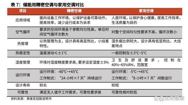 風(fēng)冷是當(dāng)前主流儲(chǔ)能方案,技術(shù)難點(diǎn)在于風(fēng)道設(shè)計(jì)和空調(diào)控制。不同儲(chǔ)能系 統(tǒng)內(nèi)電池的散熱量及擺放位置不同,為保持系統(tǒng)內(nèi)部溫差較小,需要對(duì)其內(nèi)部 的風(fēng)道進(jìn)行定制化設(shè)計(jì)。相較于家用空調(diào),儲(chǔ)能溫控系統(tǒng)中使用的精密空調(diào)具 有溫濕度控制精度高、壽命長(zhǎng)等特點(diǎn),技術(shù)壁壘較高,家用空調(diào)企業(yè)跨界存在 較大難度,目前這一領(lǐng)域的代表性企業(yè)有英維克、申菱環(huán)境等。