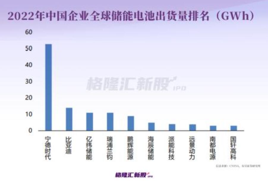 行業(yè)競爭方面,根據(jù)SNE Research的數(shù)據(jù),2022年全球儲能電池出貨量排名中,寧德時代、比亞迪、億緯鋰能分別以53GWh、14GWh和9.5GWh位列前三。