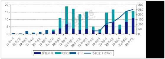 中標(biāo)數(shù)據(jù)顯示逐步回暖。7月共統(tǒng)計到儲能中標(biāo)項目124個,總規(guī)模達(dá)8.7GWh ,環(huán)比增長136% ,同比增長499% ,其中儲能EPC項目共計77個,規(guī)模3.9GWh ,儲能系統(tǒng)項目共計47個,規(guī)模為4.8GWh。