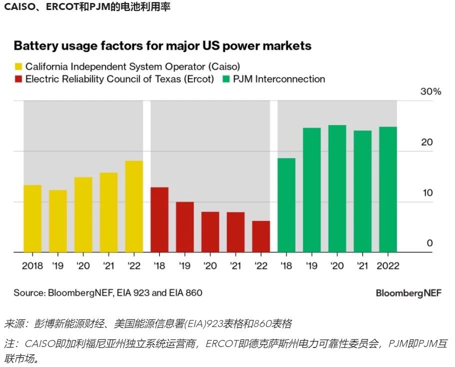 電池利用率受電池使用情況影響,也因地區(qū)而異。對于加利福尼亞州獨立系統(tǒng)運營商(CAISO),由于市場多元化的商業(yè)模式,利用率波動很大;而在德克薩斯州,對于電力可靠性委員會(ERCOT),電池主要提供調頻服務,因此電池平均利用率較低;在PJM互聯市場中,電池也主要用于調頻,但由于市場對電池的循環(huán)需求高,利用率往往相當之高。