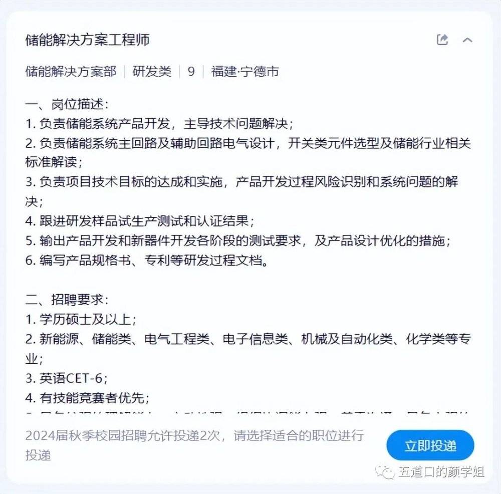寧德時代的儲能方案工程師的招聘要求是:新能源、儲能類、電氣工程類、機械類、電子信息類、化學類。