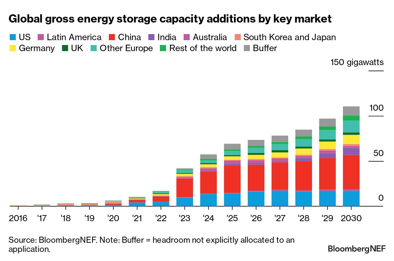 由于目標和政策改革推動,彭博新能源財經(jīng)對中國2030年儲能部署預(yù)測的上調(diào)幅度