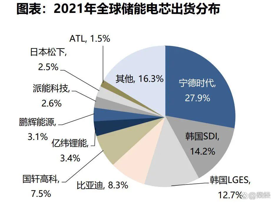 全球儲能電芯中國廠商出貨領(lǐng)先,寧德時代出貨量全球第一。