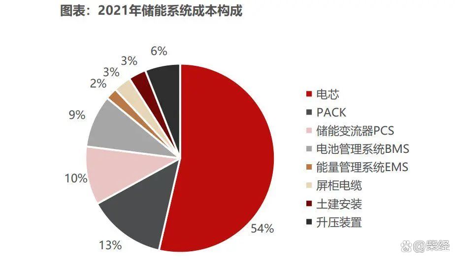 從儲能系統(tǒng)的構(gòu)成來看,儲能電池組最為主要的構(gòu)成部分是——電芯,占據(jù)儲能電池的比例約為80%。那么“電芯”和“PACK”分別占儲能系統(tǒng)的54%、13%。