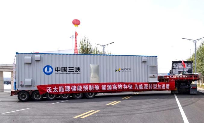 10月17日,在三峽現(xiàn)代能源創(chuàng)新示范園內(nèi),隨著2輛裝載儲能預(yù)制艙的裝備物流車緩緩駛出,標志著沃太能源儲能系統(tǒng)首套預(yù)制艙正式下線。副市長方澤出席下線儀式。