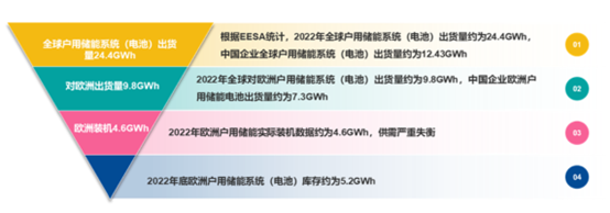 根據(jù)國(guó)內(nèi)產(chǎn)業(yè)機(jī)構(gòu)EESA統(tǒng)計(jì),2022年全球戶(hù)用儲(chǔ)能系統(tǒng)(電池)出貨量約為24.4GWh,其中對(duì)歐洲戶(hù)用儲(chǔ)能市場(chǎng)出貨量達(dá)到約9.8GWh;然而,2022年歐洲戶(hù)用儲(chǔ)能實(shí)際裝機(jī)4.6GWh,僅2022年底歐洲戶(hù)用儲(chǔ)能系統(tǒng)(電池)庫(kù)存約為5.2GWh。