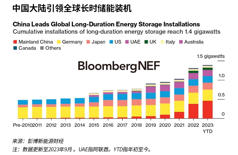 根據(jù)彭博新能源財經(jīng)的數(shù)據(jù),截止到今年9月,全球已經(jīng)投產(chǎn)的長時儲能達(dá)1.4GW/8.2GWh,而儲備項目已經(jīng)達(dá)到33GW/156GWh,其中,中國是最大的市場,占儲備項目裝機容量的92%。