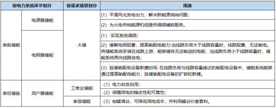 目前,儲能技術主要應用于電力系統(tǒng)。具體而言,可以將儲能技術在電力系統(tǒng)中的典型應用場景劃分為電源側、電網(wǎng)側和用戶側三個方面。其中電源側、電網(wǎng)側儲能又稱為表前儲能或大儲,用戶側儲能又稱為表后儲能。用戶側儲能分為工商業(yè)儲能與戶儲,兩者區(qū)別在于客戶群體。