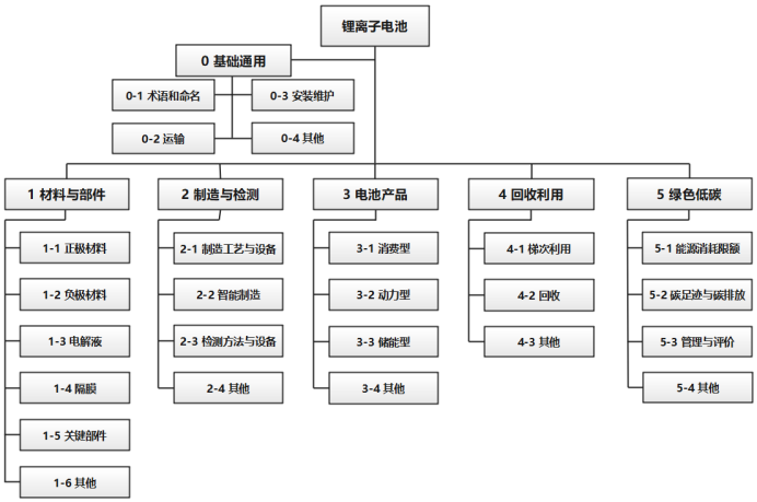 鋰離子電池綜合標準化技術(shù)體系主要包括基礎(chǔ)通用、材料與部件、制造與檢測、電池產(chǎn)品、回收利用、綠色低碳6大類、25個小類(見圖2)。