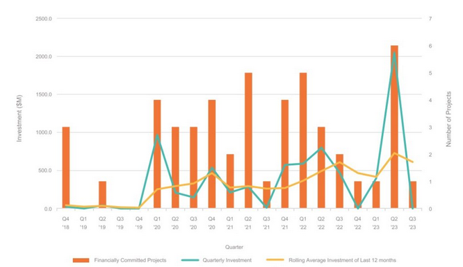 在今年第二季度,包括Waratah Super Battery電池儲(chǔ)能項(xiàng)目在內(nèi)的六個(gè)大型電池儲(chǔ)能系統(tǒng)獲得投資承諾,首次在一個(gè)季度內(nèi)突破10億澳元大關(guān)。而在今年第三季度,只有一個(gè)儲(chǔ)能項(xiàng)目獲得投資,是一個(gè)在采礦場部署的太陽能+儲(chǔ)能混合項(xiàng)目。