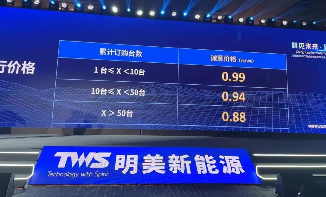 工商業(yè)領(lǐng)域的最低報(bào)價(jià)為0.88元/Wh,來(lái)自明美新能源,液冷系統(tǒng)。去年12月8日,在其舉辦的工商業(yè)儲(chǔ)能新品發(fā)布會(huì)暨戰(zhàn)略合作伙伴發(fā)展大會(huì)上,官宣了這一價(jià)格。