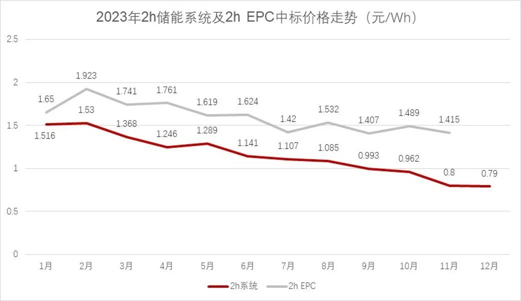 短短一年時(shí)間,儲(chǔ)能系統(tǒng)價(jià)格已經(jīng)幾近腰斬。來(lái)自中關(guān)村儲(chǔ)能產(chǎn)業(yè)技術(shù)聯(lián)盟(CNESA)的統(tǒng)計(jì),到2023年年末,2小時(shí)儲(chǔ)能系統(tǒng)中標(biāo)均價(jià)已經(jīng)跌至0.79元/Wh,較年初下降48%。而這還僅僅是平均價(jià),一些企業(yè)的報(bào)價(jià)還在平均價(jià)格之下。
