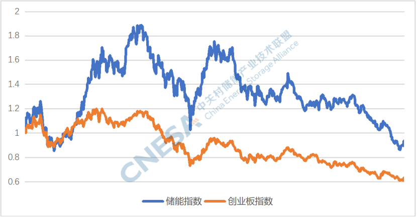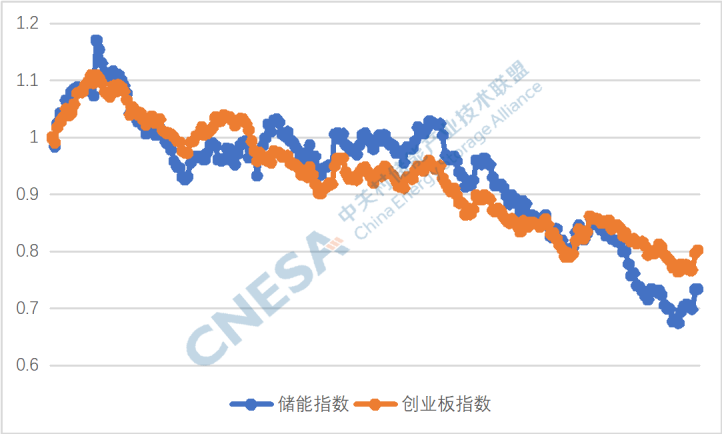 圖2: 2021-2023年儲(chǔ)能指數(shù)與創(chuàng)業(yè)版指數(shù)的對(duì)比