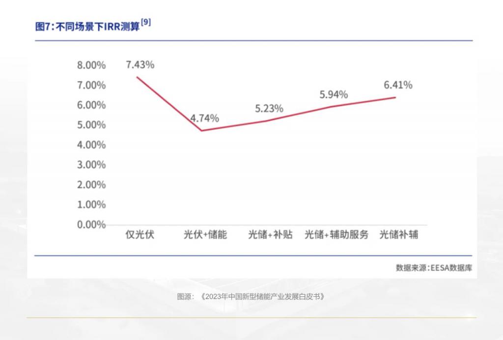 《2023 中國新型儲能行業(yè)發(fā)展白皮書》測算顯示:以內(nèi)蒙古某 100MW 光伏發(fā)電項目、配套 20MW/40MWh 儲能電站為例,其內(nèi)部收益率(IRR)在僅光伏發(fā)電的情景下,高達 7.43%;而配上儲能后,即便獲得政府補貼同時參與輔助服務,IRR 也僅 6.41%。