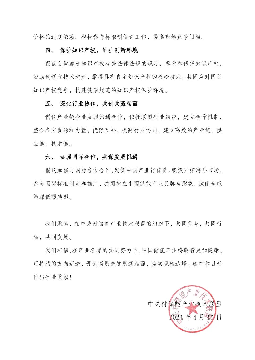 為打造新質(zhì)生產(chǎn)力,營造良好的市場環(huán)境,進(jìn)一步推動中國儲能產(chǎn)業(yè)高質(zhì)量發(fā)展,中關(guān)村儲能產(chǎn)業(yè)技術(shù)聯(lián)盟聯(lián)合儲能產(chǎn)業(yè)各方共同發(fā)出“中國儲能產(chǎn)業(yè)高質(zhì)量發(fā)展倡議 ”。倡議包括強(qiáng)化安全意識,保證產(chǎn)品質(zhì)量;加強(qiáng)行業(yè)自律,構(gòu)建良性競爭;加快技術(shù)創(chuàng)新,提升核心競爭力;保護(hù)知識產(chǎn)權(quán),維護(hù)創(chuàng)新環(huán)境;深化行業(yè)協(xié)作,共創(chuàng)共贏局面;加強(qiáng)國際合作,共謀發(fā)展機(jī)遇六點(diǎn)倡議。