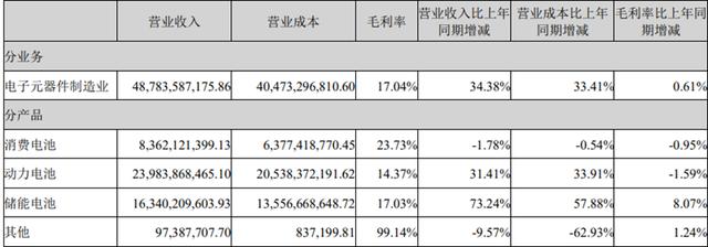 由于多數(shù)訂單為長期合同,儲能電池業(yè)務(wù)受價格戰(zhàn)影響較小,營業(yè)收入達到163.4億元,同比增長73.24%,占總營收的33.5%,毛利率也提升了8.07個百分點至17.03%。