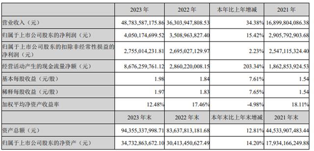 2023年,億緯鋰能實現(xiàn)營業(yè)收入487.8億元,同比增長32.38%;歸母凈利潤為40.5億元,同比增長15.42%,其中本部業(yè)務(wù)凈利潤為35.4億元,同比增長30.19%;扣非更是同比只增長2.23%;毛利率達到17.04%,同比增長0.61個百分點;凈利率達到9.27%,同比降低0.84個百分點。