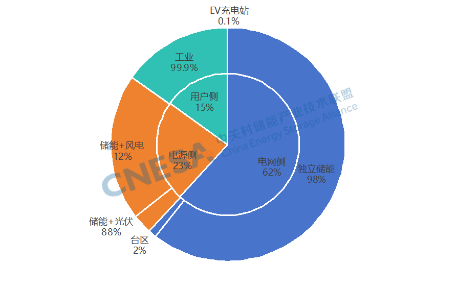 獨立儲能占比回升,獨立儲能、新能源配儲主導市場。從應用分布上看,