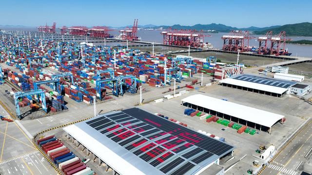 炎炎夏日,寧波舟山港梅山港區(qū)“綠意”正盎然:百米風(fēng)機(jī)悠然轉(zhuǎn)動,清潔能源設(shè)備高效運(yùn)行,岸電設(shè)施源源不斷地為集裝箱貨輪提供電能,搭載太陽能光伏發(fā)電系統(tǒng)的10臺遠(yuǎn)控橋吊有序作業(yè)……綠色碼頭初具雛形。