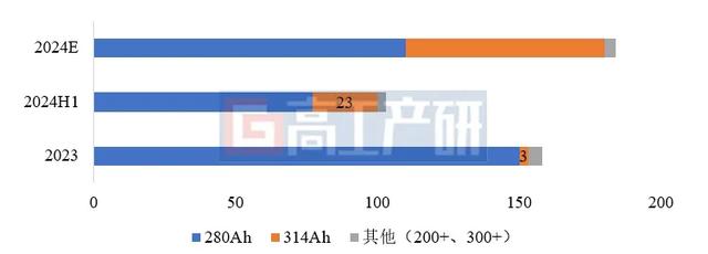 2023年下半年以來,企業(yè)加速切換314Ah產(chǎn)線,部分企業(yè)已將280Ah作為庫存拋售。截至2024年上半年,314Ah有效產(chǎn)能已達40GWh。