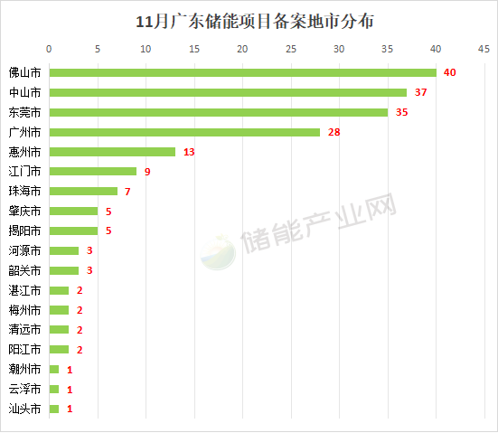 從各地市分布情況來看,儲能備案項目地市分布數(shù)量排名第一的佛山,為40個;中山、東莞位列第二和第三,分別為37個和35個。前三名備案數(shù)量已經(jīng)占據(jù)廣東省57%以上。