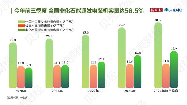 中國(guó)電力企業(yè)聯(lián)合會(huì)統(tǒng)計(jì)數(shù)據(jù)顯示,截至2024年9月底,全國(guó)全口徑發(fā)電裝機(jī)容量31.6億千瓦,煤電占總發(fā)電裝機(jī)容量的比重為37.3%,同比降低4.4個(gè)百分點(diǎn);非化石能源發(fā)電裝機(jī)容量17.9億千瓦,同比增長(zhǎng)24.0%,占總裝機(jī)容量比重為56.5%,比上年同期提高4.5個(gè)百分點(diǎn)。這表明中國(guó)能源結(jié)構(gòu)持續(xù)優(yōu)化,清潔能源在總裝機(jī)中的重力提升,為實(shí)現(xiàn)“雙碳”目標(biāo)奠定了基礎(chǔ)。