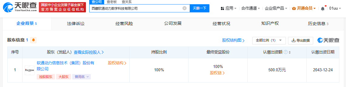 近日,西藏軟通動(dòng)力數(shù)字科技有限公司成立,法定代表人為于麗群,注冊(cè)資本500萬(wàn)人民幣,經(jīng)營(yíng)范圍包括數(shù)字文化創(chuàng)意軟件開(kāi)發(fā)、數(shù)字內(nèi)容制作服務(wù)、物聯(lián)網(wǎng)應(yīng)用服務(wù)、互聯(lián)網(wǎng)數(shù)據(jù)服務(wù)等。股東信息顯示,該公司由軟通動(dòng)力(301236)全資持股。