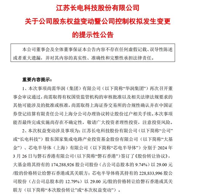 3月26日晚間,長(zhǎng)電科技(SH600584,股價(jià)28.25元,市值505.3億元)發(fā)布公告稱,公司股東國(guó)家集成電路產(chǎn)業(yè)投資基金股份有限公司(以下簡(jiǎn)稱“大基金”)、芯電半導(dǎo)體(上海)有限公司(以下簡(jiǎn)稱“芯電半導(dǎo)體”)分別與磐石香港有限公司(以下簡(jiǎn)稱“磐石香港”)簽訂《股份轉(zhuǎn)讓協(xié)議》,大基金及芯電半導(dǎo)體均以29元/股價(jià)格將合計(jì)所持22.53%公司股份轉(zhuǎn)讓給磐石香港或其關(guān)聯(lián)方;完成后公司控股股東將變更為磐石香港或其關(guān)聯(lián)方,實(shí)控人將變更為中國(guó)華潤(rùn),公司股票復(fù)牌。