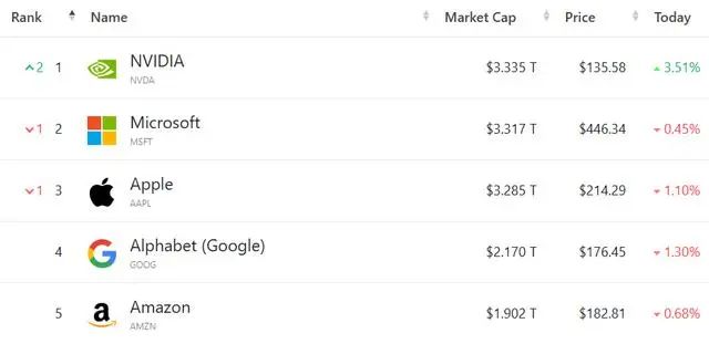 當(dāng)?shù)貢r間周二美股收盤,美國芯片企業(yè)英偉達上漲3.51%,報135.58美元再刷歷史新高,總市值達3.335萬億美元,一舉超過了微軟和蘋果,成為全球最具價值的上市公司。