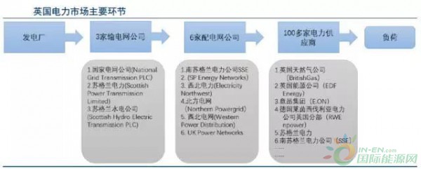 整個英國由3家輸電網(wǎng)公司負(fù)責(zé)區(qū)域性輸電網(wǎng)絡(luò)。在配電網(wǎng)層面,英國被劃分為14個區(qū)域并由6大配電網(wǎng)公司(DNOs)運營。配電公司作為獨立于輸電和售電環(huán)節(jié)的中間人,通過運作其擁有的配電網(wǎng)絡(luò)將輸電網(wǎng)傳輸?shù)碾娏Ψ峙浣o民用和工商業(yè)用戶。但是配電公司并不參與售電的環(huán)節(jié)。與發(fā)電、輸電和配電公司不同的是,英國電力供應(yīng)商被定義為支付配電網(wǎng)絡(luò)費用并從電力批發(fā)市場中購買電力,再以一定價格出售給自己顧客的商業(yè)實體。